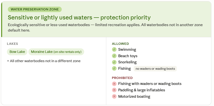 Moraine Lake has been placed in a Water Preservation Zone due to its ecological importance and role in planned fish restoration efforts, meaning personal watercraft and similar equipment are not permitted.