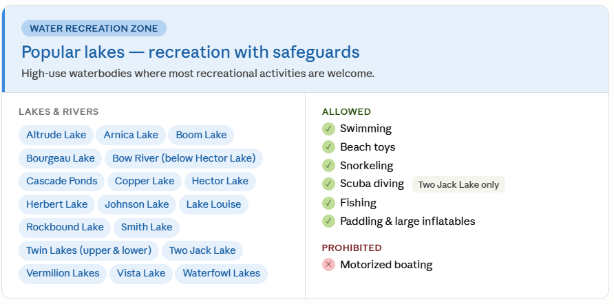 Water Recreation Zones, which include Lake Louise, will continue to allow most activities, provided users follow mandatory decontamination practices such as cleaning, draining and drying all equipment between uses.