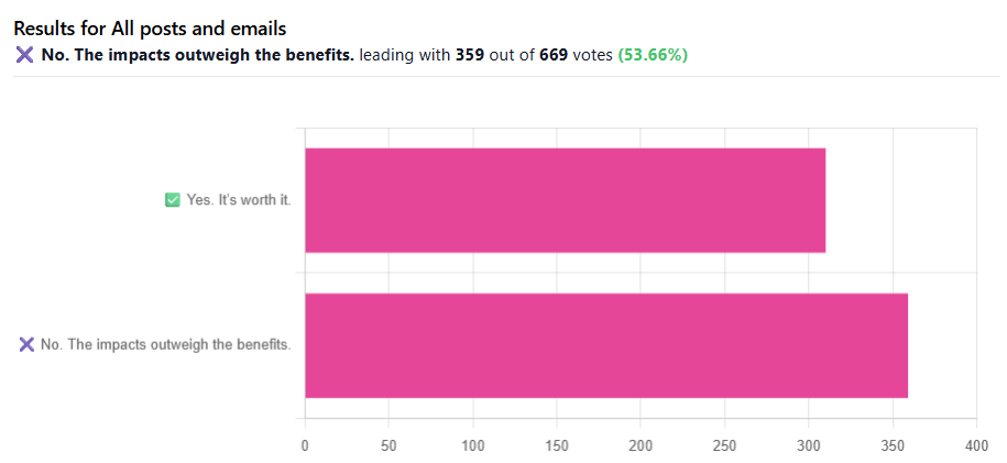 Of 669 respondents, 53.66% said the negative impacts of skijoring now outweigh the benefits, while 46.34% said the event is still worth it. The margin is slim. The themes in the accompanying comments, however, are not.