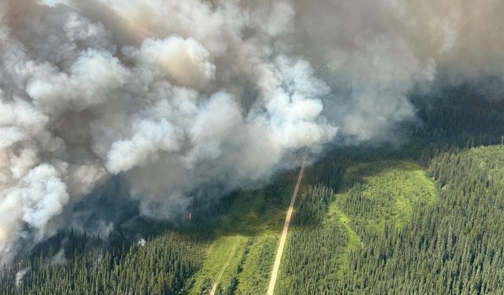 As flames climbed steep valley slopes, they generated their own weather system. “High fuel consumption, moderate surface winds, and steep slopes promoted towering convection columns with strong updrafts,” NRCan reported. Near the main column, “fire-generated wind speeds… reached up to 200 km/h.”